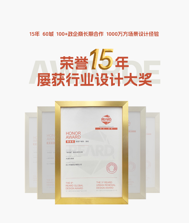 2020·第五届REARD全球设计大奖 2020·ID+G国际空间设计大奖/金创意奖 2020·景筑奖商业综合体项目二等奖 2020·十大最具品牌价值机构 2020·REARD城市更新设计推荐榜 2019·创新中国C+十佳最具匠心品质设计机构 2019·创新中国C+十佳最具匠心品质项目 2019·创新中国C+十大领军人物设计奖